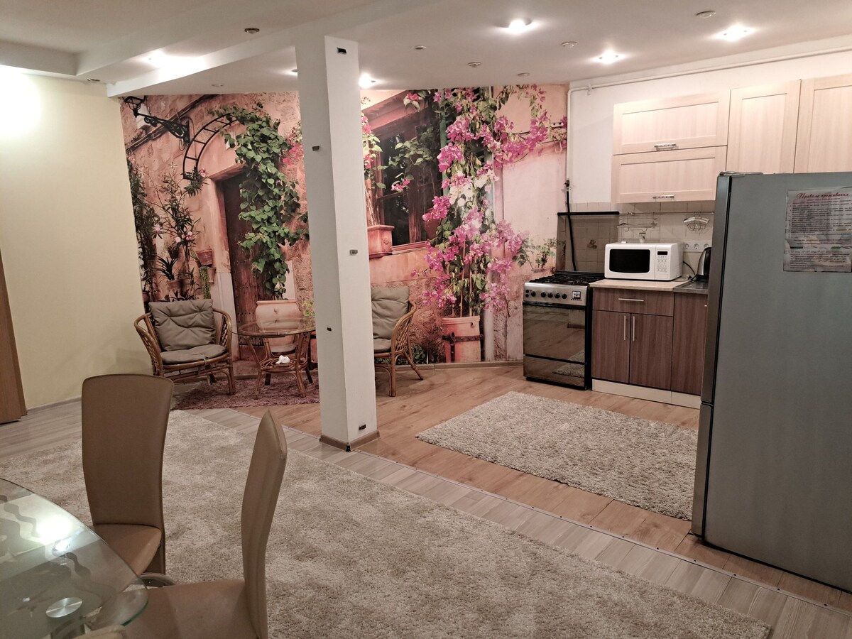 Udoban trosobni stan u istorijskom centru Užgoroda, u privatnoj zgradi sa dvorištem, sa sjajnim pogledom od prozora do centra, katedrale. Prostrane privatne sobe, skupa kuhinja, moderni uređaji, klima-uređaji, mašina za pranje i sušenje veša. Parking ispod kuće do jutra je besplatan. Možete da roštiljate u unutrašnjem dvorištu. Brzi internet. Mogućnost dodatnog kreveta, kao i prenosivog kreveca.
