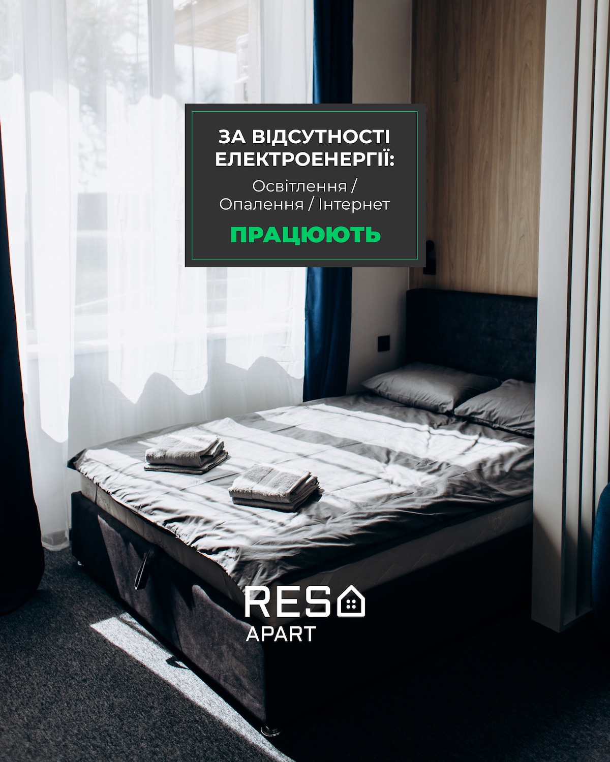 Prostrani dvosobni apartmani u odmaralištu Poljana, „Sunčano Zakarpatje“. Apartmani su potpuno namešteni i opremljeni svom potrebnom opremom za udoban boravak. Wi-Fi i digitalna TV. Buvet sa mineralnom vodom nalazi se u prizemlju zgrade. Prodavnice i pijaca su takođe na pešačkoj udaljenosti. Na teritoriji kuće nalaze se: restoran, bazen, sauna, igralište za decu i besplatan parking.