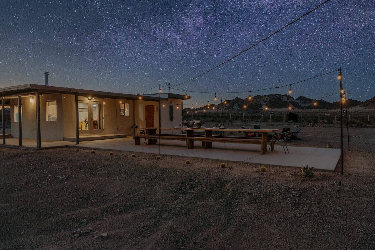 Probudite se uz panoramsko pustinjsko nebo samo 10 minuta od nacionalnog parka Džošua Tri. Ovaj elegantni smještaj s 1 spavaćom sobom savršen je za parove, osobe koje rade na daljinu i zvijezde, sa privatnom hidromasažnom kadom, udobnom ognjištem i nevjerovatno brzom Wi-Fi mrežom. Provedite dane istražujući park, vratite se da se opustite u visećoj ležaljci, opustite se pod zvijezdama ili se okupite oko vatre. Ujutro uživajte u potpuno opremljenoj kuhinji i doručkujte ispod pergole za drvenim trpezarijskim stolom. Veliko ograđeno dvorište idealno za kućne ljubimce.