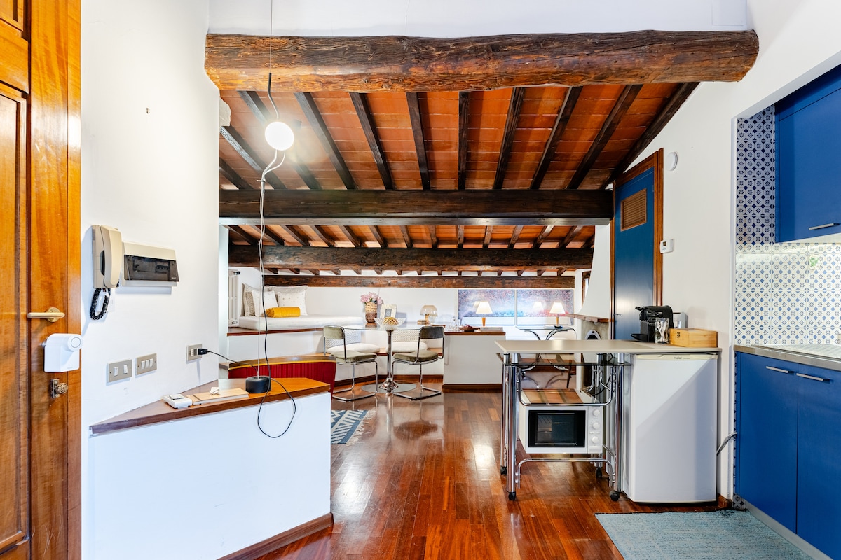 Udobno potkrovlje na 4. spratu, sa izloženim gredama i prozorima sa pogledom na krovove Firence, sa zadivljujućim pogledom na grad. Savršeno za one koji žele da dožive autentičan život u srcu istorijskog centra. Svijetla, dobro održavana i tiha — idealna za kratak i nezaboravan boravak u Firenci.