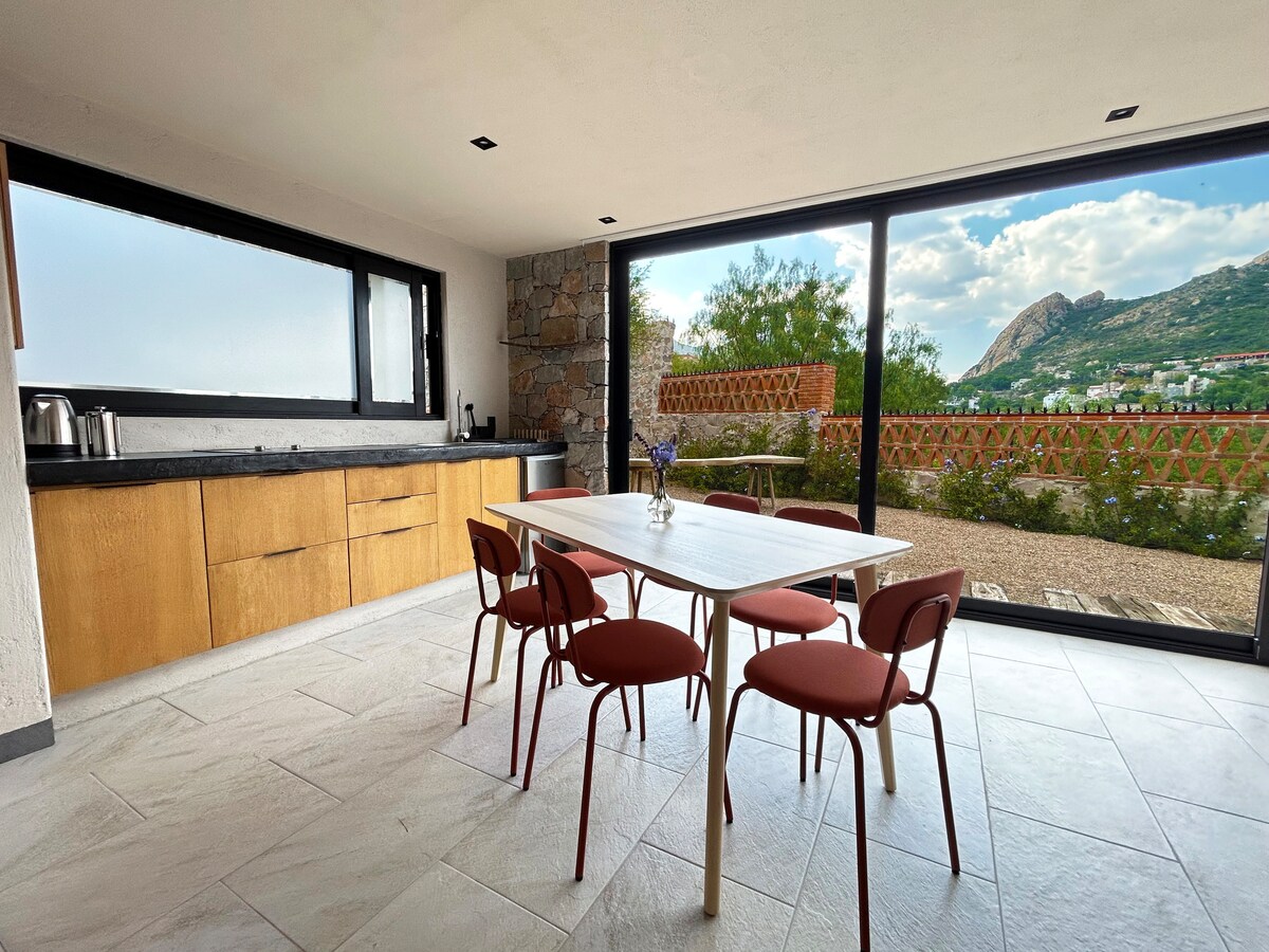 Najbolje mesto za boravak u čarobnom selu Bernal je naš prelepi dvosobni stan. Ima minimalistički dizajn koji meša materijale i flore karakteristične za region kako bi se postigla prijatna atmosfera koju će uvijek uokviriti Peña de Bernal, jer je bio orijentisan da ima najbolji pogled na monolith. Nalazimo se u centru grada, savršen je za šetnju. Imamo nadzor u svakom trenutku i najbolju terasu.