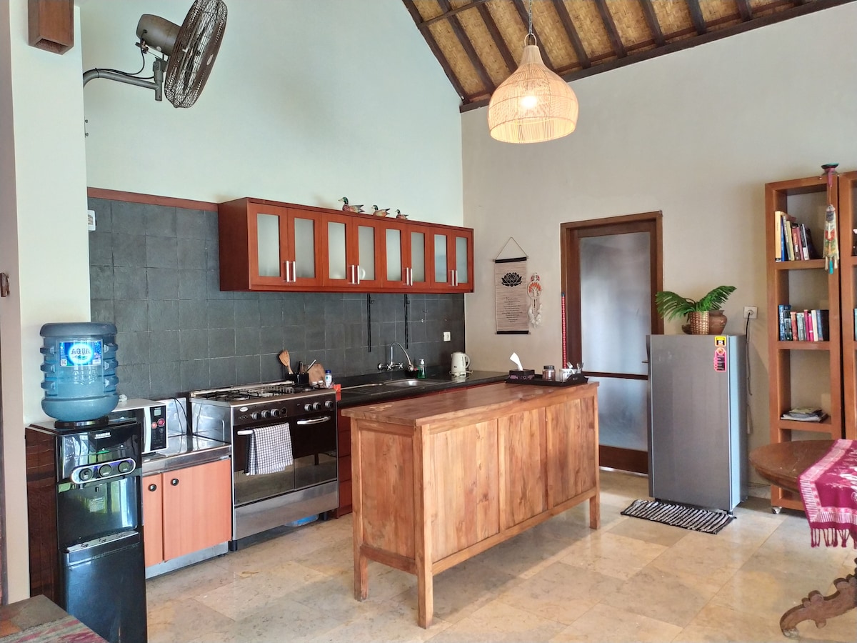 Luxurious private villa with 6x3 meter pool. Secure, private, safe. Lush garden and sheltered but open air kitchen for dining and relaxing by the pool. Queen bed, outside tub and shower, with fish pond view, fully equipped kitchen. AC, TV, great WiFi, daily cleaning and set breakfast is included. We are an 8 minute walk from the main road, or a short scooter ride. This means peace and quiet, and no car noise. Our staff will be happy to drive you in by scooter if needs be.