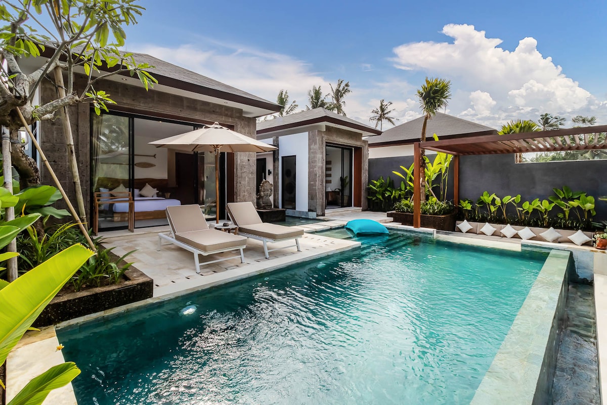Luxurious private villa with 6x3 meter pool. Secure, private, safe. Lush garden and sheltered but open air kitchen for dining and relaxing by the pool. Queen bed, outside tub and shower, with fish pond view, fully equipped kitchen. AC, TV, great WiFi, daily cleaning and set breakfast is included. We are an 8 minute walk from the main road, or a short scooter ride. This means peace and quiet, and no car noise. Our staff will be happy to drive you in by scooter if needs be.