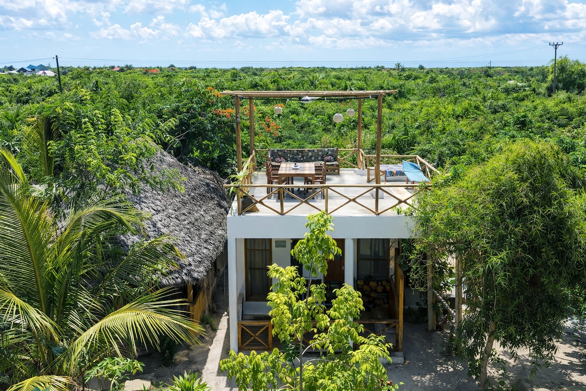 Our new Studio has everything you need for your perfect island holiday in Zanzibar!Right on the white sand beach of Jambiani with turquoise waters. Relax in style on the private terrace with perfect ocean view.The studio is situated at the 1st floor of a beach house, with a shaded terrace, ocean view, outdoor dining area,wooden chairs&sun lounger. Private access to your stylish unit. Queen bed with nice linens and the bathroom always hot water! Cute kitchenette with fridge&stove. Truly a gem!