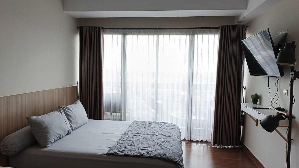 Your home away from home. Uniquely designed and cozy studio apartment for 2 guests + 1 little child. The room equipped with 1 queen size bed, modern bathroom, kitchen with basic cooking equipment, and balcony. Free parking, pool, gym, lobby area with cafe, restaurant, laundry, and mini market. Facilities: - 55 " smart TV - Wifi - AC - hot shower - refrigerator - microwave - electric stove - kettle - kitchen sink - basic cooking equipment - hair dryer - iron Note: - No breakfast