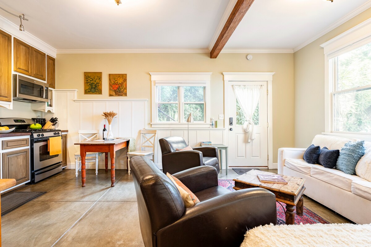 Uživajte uz kafu u zenu, dvorištu prekrivenom lozom u ovoj izolovanoj seoskoj kući smeštenoj u zadnjem delu perioda iznajmljivanja u Berkliju. Čista bela posteljina, zanatski nameštaj i obojene drvene obloge čine sofisticirano, ali rustikalno utočište. Glavna soba je udobna sa velikim krovnim prozorom, udobnim bračnim krevetom, okretnom stolicom i radnim stolom i stolicom. Postoji mala čajna kuhinja. Vani se nalazi kamena terasa, klupa za ljuljanje koja gleda na jezero koi i mali spoljni sto i stolice. ZCSTR2021-0842