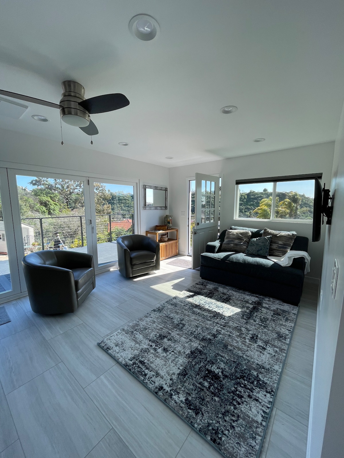 The one bedroom, one bath unit was recently remodeled (in 2017) and includes all new kitchen, bathroom, full size laundry and air conditioning. The large 400 square foot private deck has new outdoor furniture with views of Mission Bay and gorgeous sunsets year round. Enjoy a show on the 50" 4K LG smart TV in the living room which offers Netflix, Amazon Video, and major network TV stations. Cook a delicious meal in the kitchenette complete with a mini-fridge/freezer, microwave, electric stove top, coffeemaker, and more. If you plan to head to the beach, the storage ottoman is secretly a "beach box" containing a couple of folding chairs, beach toys, towels and a small cooler. The unit is stocked with coffee, shampoo, conditioner, laundry supplies, iron, and more. Filtered water is provided via a faucet on the kitchen sink. Easy check-in via a numeric keypad on the front door with the code provided prior to arrival. Plenty of street parking is available. We love meeting new people and live next door in the main house so we are available most anytime. We are both from San Diego and still love to explore the latest new spots so we are happy to give recommendations. Bay Park is a great central neighborhood originally built in the early 1940s. It was recently voted the most livable neighborhood in a recent San Diego poll. Check out the restaurants on Morena Boulevard, which are just a few minutes' walk away or explore all of the major attractions of San Diego easily. The house has easy access to I-5 and is only 10-15 mins from downtown, Sea World, the San Diego Zoo and the airport. The private guest house is located across from Mission Bay and within walking distance to bay, market, restaurants and coffee shops. Uber/Lyft is $8 to $14 to most of San Diego's main attractions. There is a bit of white noise from the highway down the hill near Mission Bay when out on the deck but nothing too bad, just worthy of mention. The unit has double paned vinyl windows so it's quiet indoors.