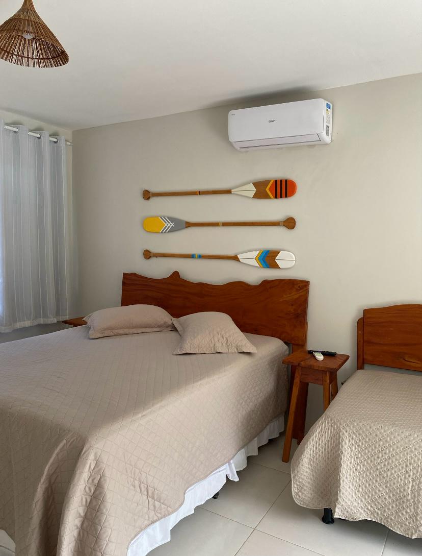 Ideal for a couple or two people with separate beds, with the possibility of adding an extra bed. The room features a queen-size bed or two single beds, air conditioning, minibar, safe, telephone, and optional TV, along with gas water heating. The balcony includes a hammock and lounger. No deck de madeira, conta com rede e espreguiçadeiras. Já no espaço interno, conta com duas camas twin ou uma cama de casal queen size, mosquiteiro dossel branco, cadeiras para leitura, TV HD a cabo, ar condicio.