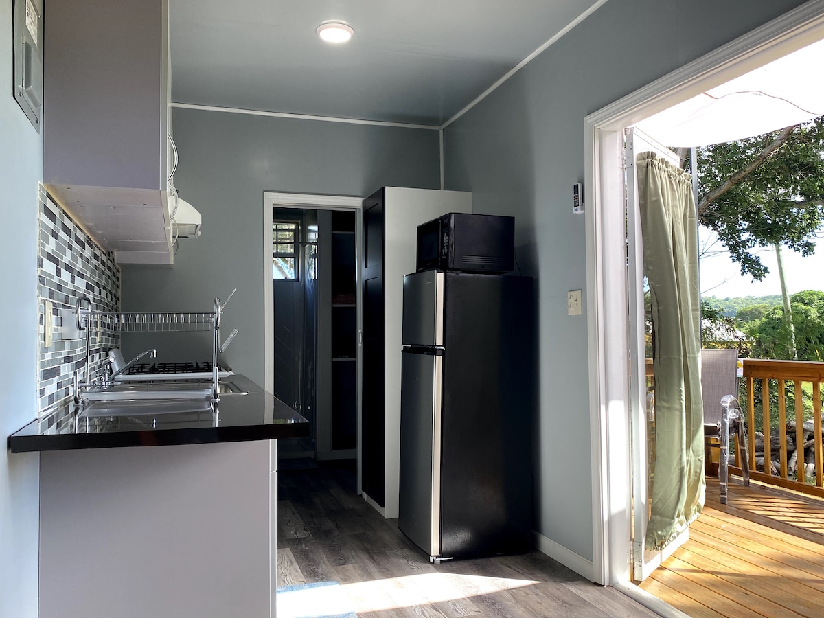 Jedinstven smještaj u udobnom izmijenjenom brodskom kontejneru. Udoban, sjenovit, čist sa svim udobnostima tradicionalnog studio apartmana. Savršeno za 2! Novoizgrađeni, kompletni kuhinjski sadržaji, ViFi, A/C, strimovanje televizije uživo i paluba za sedenje i snimanje povetarca ili uživanje u voćkama. Vožnja od 15 minuta ili manje dovešće vas do aerodroma Henry E. Rohlsen, tržnog centra Sunny Isles, plaže Cane Bay ili istorijskog grada Kristijana gdje možete da kupite suvenir ili nešto pojedete.