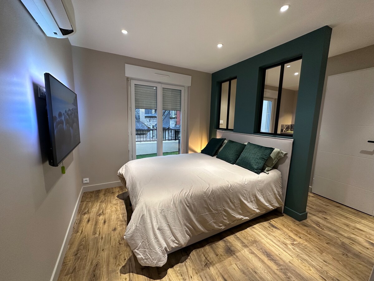 U samom srcu centra grada Brive-la-Gaillarde, opustite se u ovom mirnom i elegantnom apartmanu. Ovaj stan je veoma dobro opremljen sa reverzibilnim klima-uređajem, TV-om od50inča, Wi-Fi mrežom, mikrotalasnom rernom, aparatom za kafu, tuš kabinom, malom otvorenom garderobom sa Tediber posteljinom. Sladoled na torti! Uživajte na terasi na krovu sa pogledom koji oduzima dah, a sve je u pratnji malog baštenskog nameštaja iz smole kako biste u potpunosti uživali u suncu.