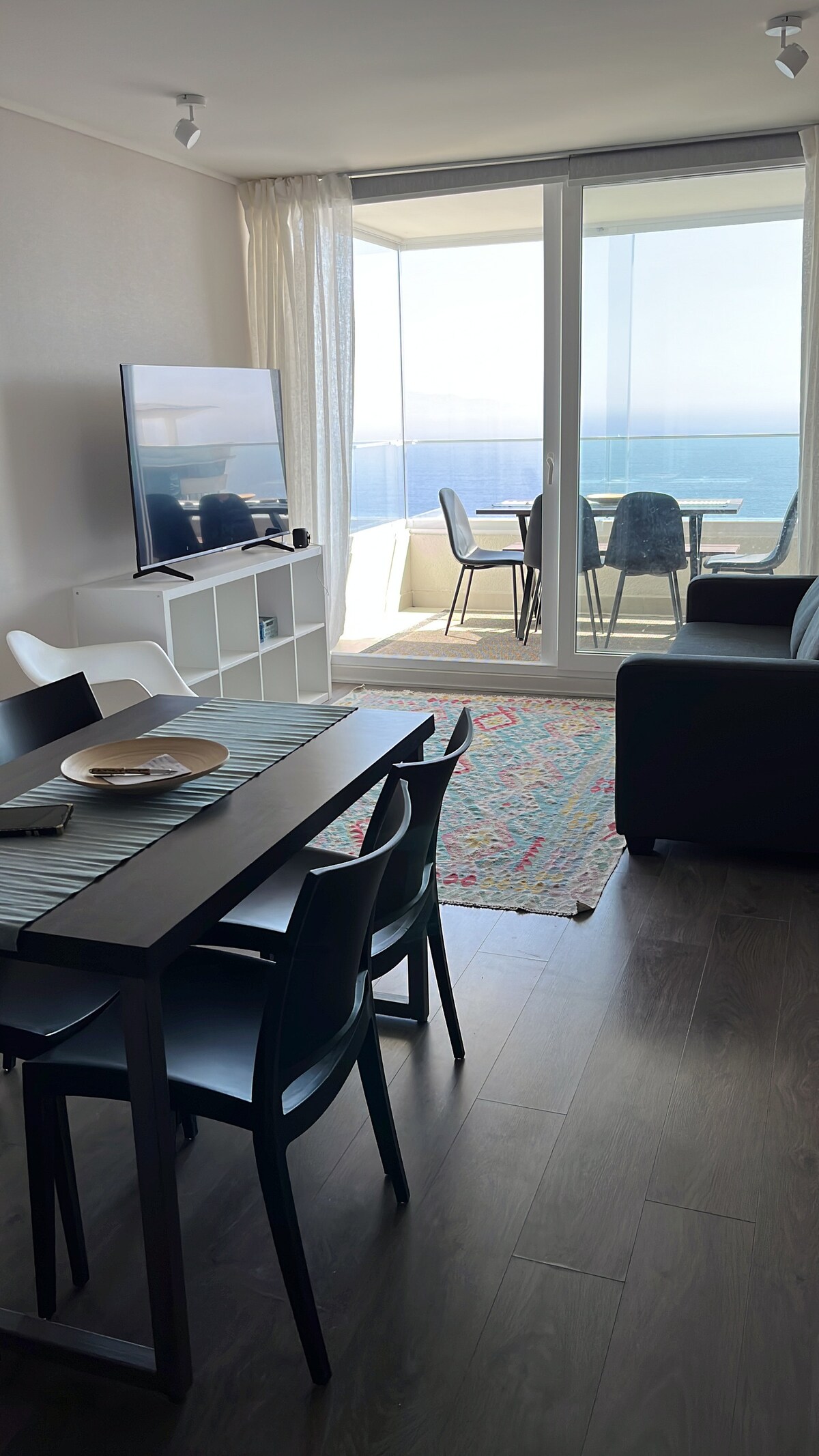 Novi i prostrani stan u okruženju (40 m2), sa odličnom raspodjelom prostora, pogledom na more, lukobran i zaliv Valparaiso. Velika terasa za uživanje u dobroj kafi ujutru uz zvuk mora ili uz bogato piće u toplom zalasku sunca. Bračni krevet sa dušekom visokog kvaliteta i udobnošću. Smart TV 49" i brzi WIFI internet, pristup nacionalnim kanalima samo putem onlajn signala. 5 minuta od sektora Reñaca. POŠALJITE PODATKE O GOSTU (PRISTUP)