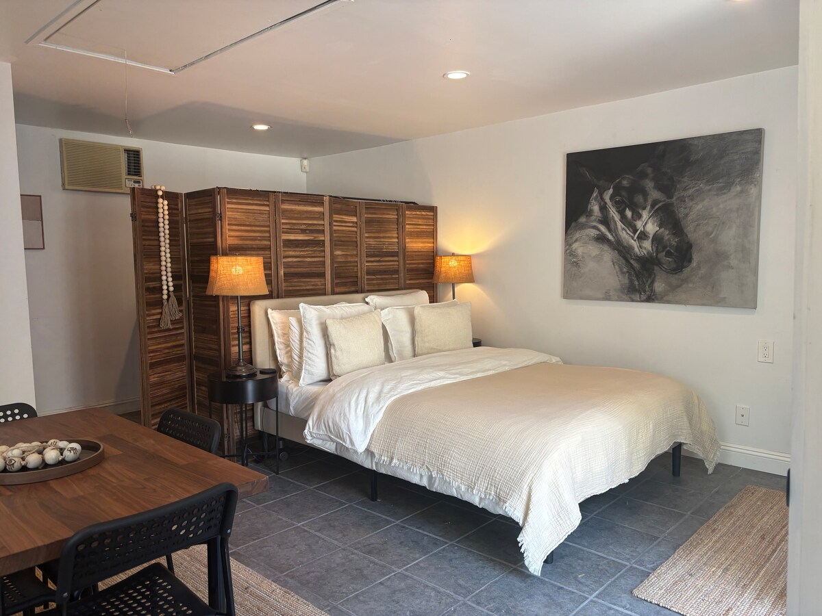 This is a very comfortable NON-SMOKING guesthouse/ studio room with private entrance. Absolutely NO ANIMALS allowed due to my allergies. It has one queen bed. Private full bathroom. There is dresser space as well as hangers. It also has a desk for work space. Smart TV can be used with streaming services. This space does not have a kitchen. But it does have a small fridge and a microwave. Absolutely no filming or photography anywhere on the premises. No visitors allowed without my consent.