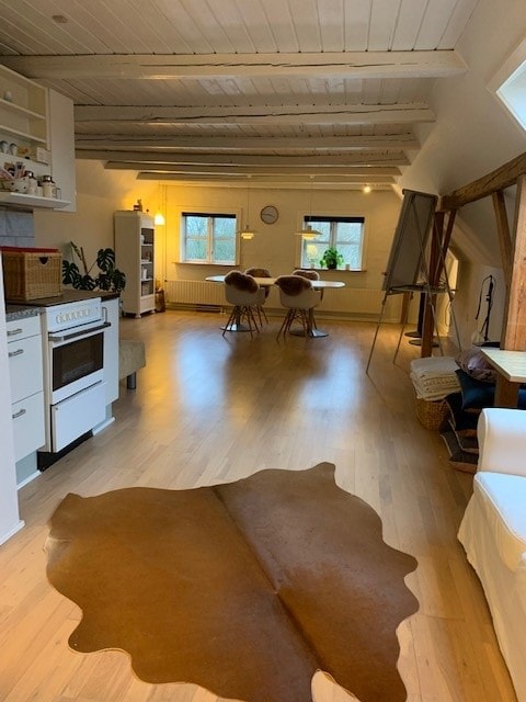 Divan dom u Hjertingu s pogledom na vodu. Stan se sastoji od privatnog ulaza, spavaće sobe sa bračnim krevetom i ormara. Velika dnevna soba, kupatilo sa podnim grejanjem i mašinom za sušenje veša. Kuhinjski prostor sa izlazom na veliki balkon sa sjajnim pogledom.