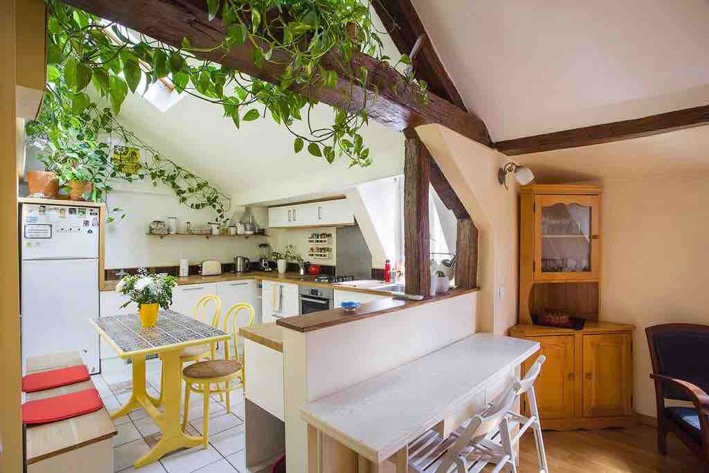 Heart of Montmartre, charming, fully equipped, 3 bedroom, 970 sq feet/90sqm apartment with beautiful Eiffel Tower view, minutes from the Sacré Cœur, shops, restaurants; easy, fast access to transport to all major sites Glavna spavaća soba – bračni krevet (160×200 cm), pogled na baštu/restoran Spavaća soba 2 - bračni krevet (140x200cm), pogled na baštu/restoran Spavaća soba br. 3 – krevet 120×200 cm; pogled sa krova 1 malo kupatilo sa kadom 1 malo kupatilo sa tuš-kabinom 1 WC šolja
