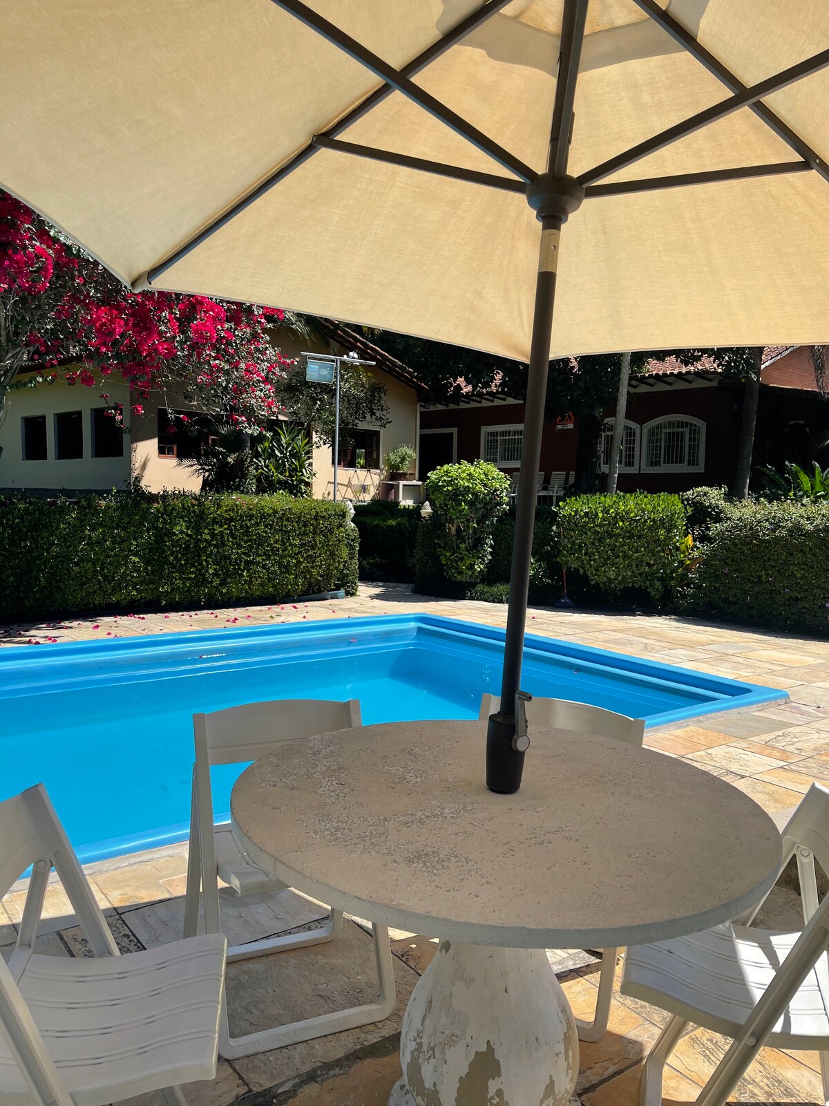 Savršena kuća za život sa onima koje volite tokom cijele godine. Savršeno za porodice i male grupe. U kondominijumu (igralište, travnata polja i lokva), sa širokim i šumovitim ulicama, bazenom (pogledajte „druge važne informacije”). Lareira, TV sa ulazom za tokove, kuhinja opremljena i integrisana u bazen. Mezzanino sa kućnim kancelarijskim prostorom. Voćnjak sa voćkama na imanju od 800m². U blizini 3 parka u regionu (Animália-15min Bichomania-10min i Pet Zoo-5min).