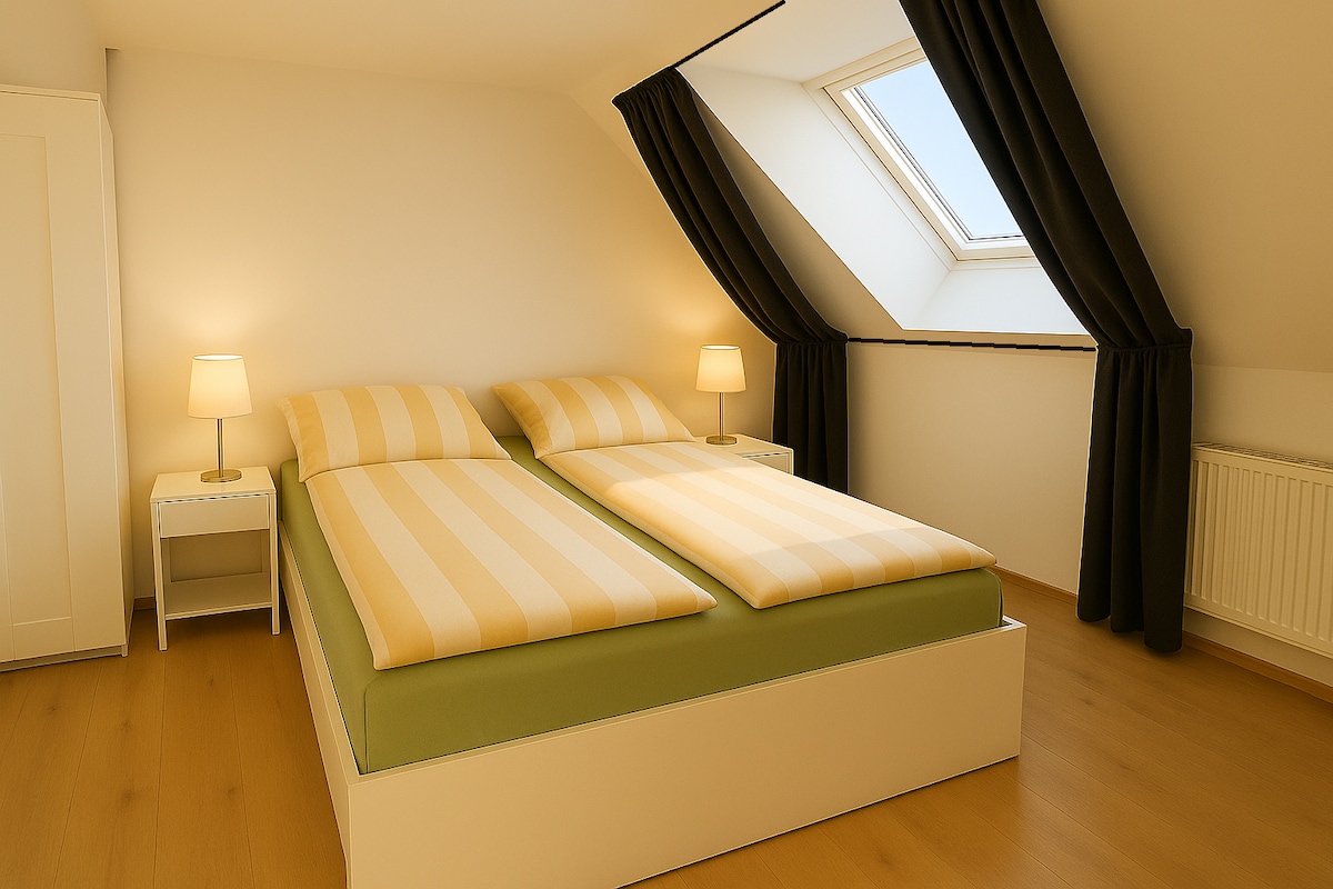 Sveže renoviran stan nalazi se na laganom terenu bungalova sa ravnim krovom koji se nalazi u mirnom i tihom delu grada na severu grada. Stan uključuje veliku spavaću sobu sa bračnim krevetom, udobnu dnevnu sobu i trpezariju sa udobnim kaučem na razvlačenje, moderno kupatilo sa tušem i kompletnu ugrađenu kuhinju. Centar grada je udaljen samo petnaest minuta hoda, ali takođe postoji autobuska stanica odmah ispred vrata, kao i besplatan parking.