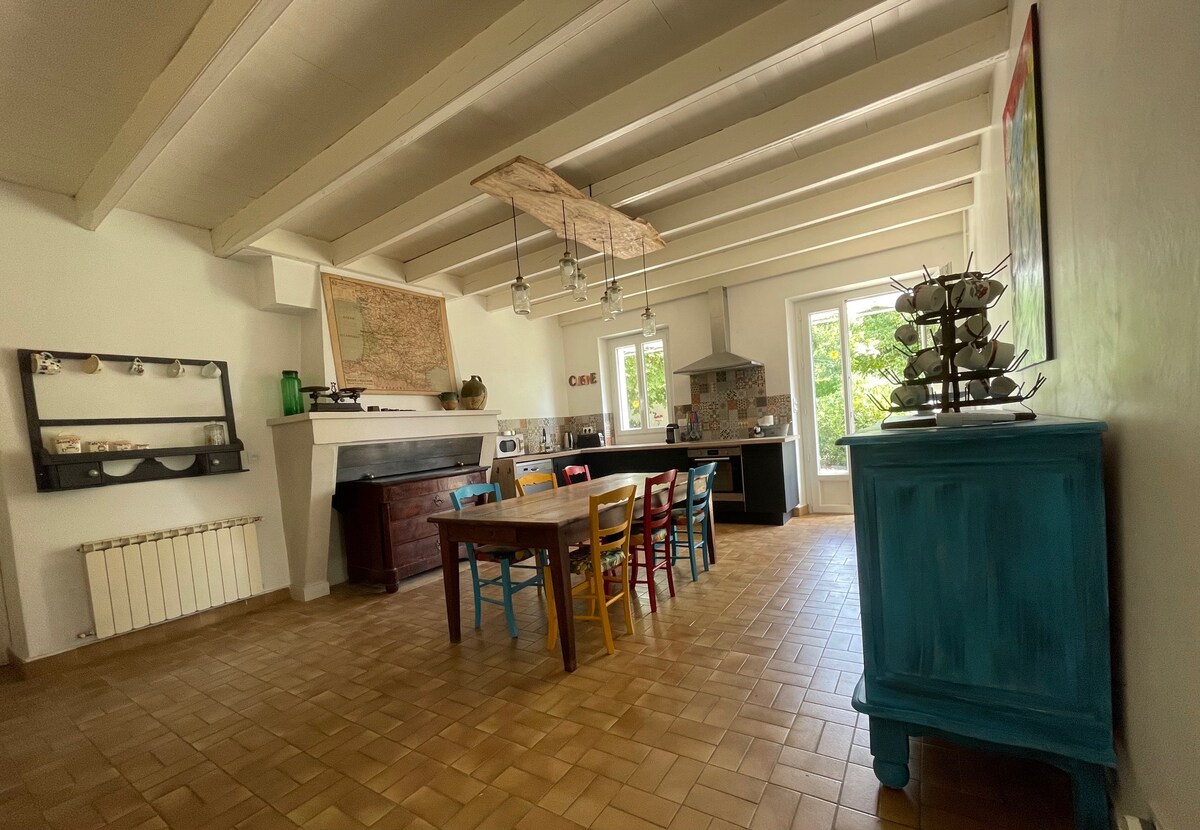Cette ancienne ferme est idéalement située au carrefour de la Dordogne et de la Gironde entre Bordeaux et le Périgord. Elle vous offrira un bel espace extérieur et de beaux volumes intérieurs; sa chambre aux lits wagons fera la joie des enfants et sa grande cuisine de ferme celle des parents. La balançoire, la table de ping-pong ou encore un espace pour les plus petits, et des jeux de société seront à disposition. De nombreux lieux d'excursions : St Emilion, Bergerac, Monbazillac ...