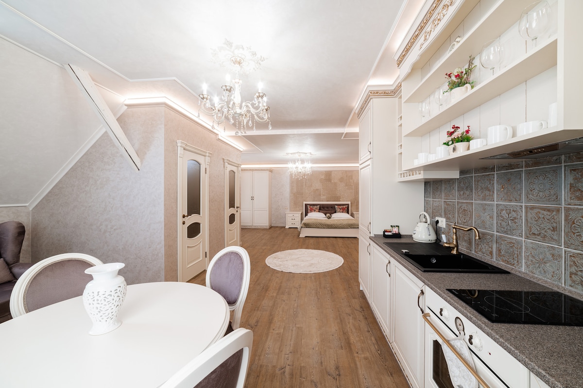 Stan se nalazi na 10. spratu zgrade, odakle se pruža neverovatan pogled na grad. Dizajn: kombinacija loft, neoklasičnog i art-deco stila: ovalna kada, pored panoramskog prozora, omogućava vam da se opustite i posmatrate noćni grad; kada se nalazi na prirodnom belom šljunku. Kamin, u kombinaciji sa mekim nameštajem, stvara udobnost i udobnost. Meki deo, ugrađen u panoramski prozor, omogućava vam da uronite u romantičnu noćnu atmosferu.