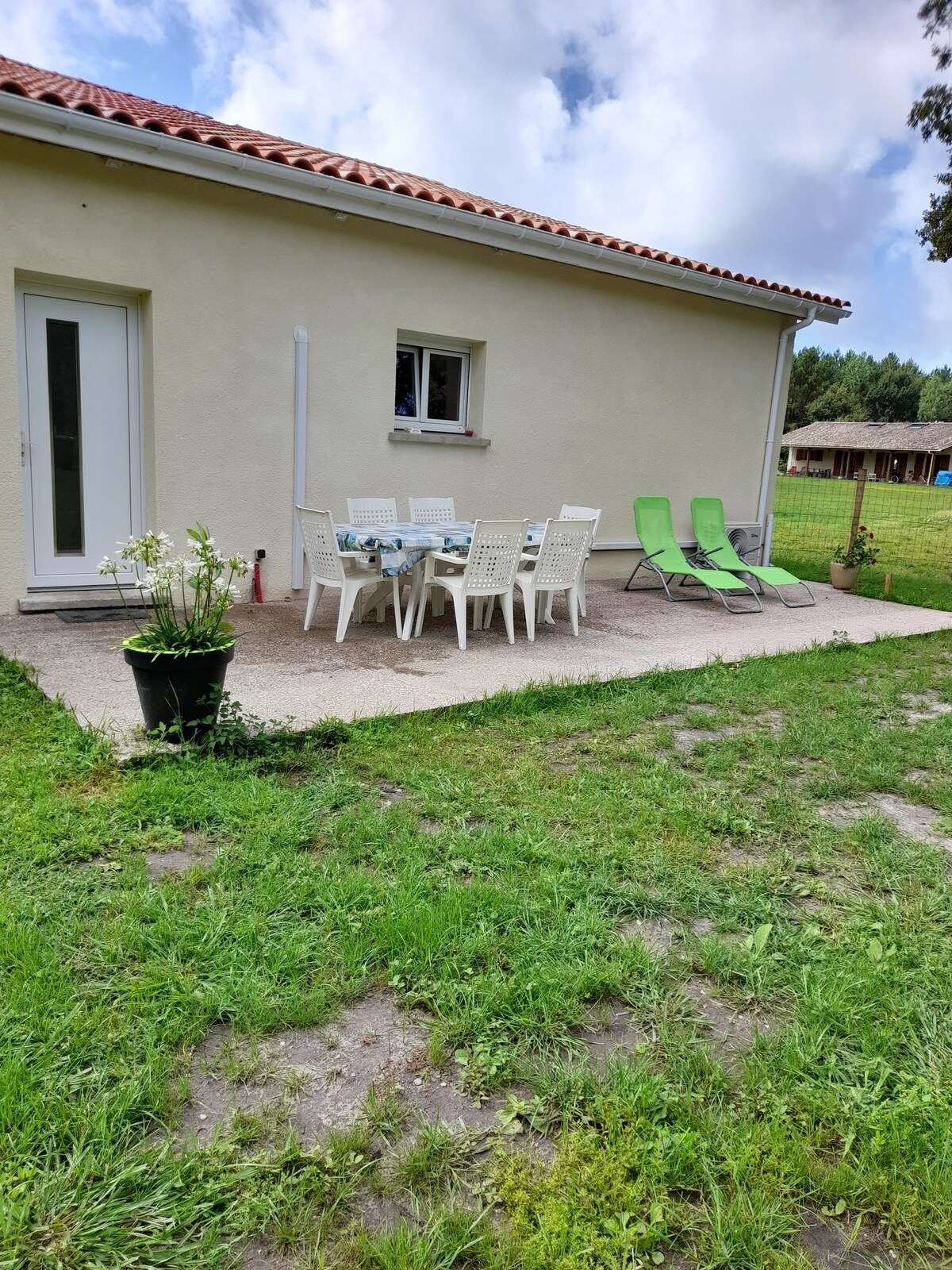 Maison de Vacances à Montalivet. (English speaking Host) Maison neuve pour 6 personnes située au calme à 1,2km de l'océan (environ 12 min à pieds). Entièrement équipée et aménagée, vous vous y sentirez comme chez vous! Composée de 3 chambres dont une suite parentale, 2 salles d'eau au total, 2 WC, une terrasse couverte avec barbecue/plancha/salon de jardin et table extérieure. Cuisine entièrement équipée (lave-vaisselle-four-induction-micro-ondes-lave linge- machine à café -grille pain etc)