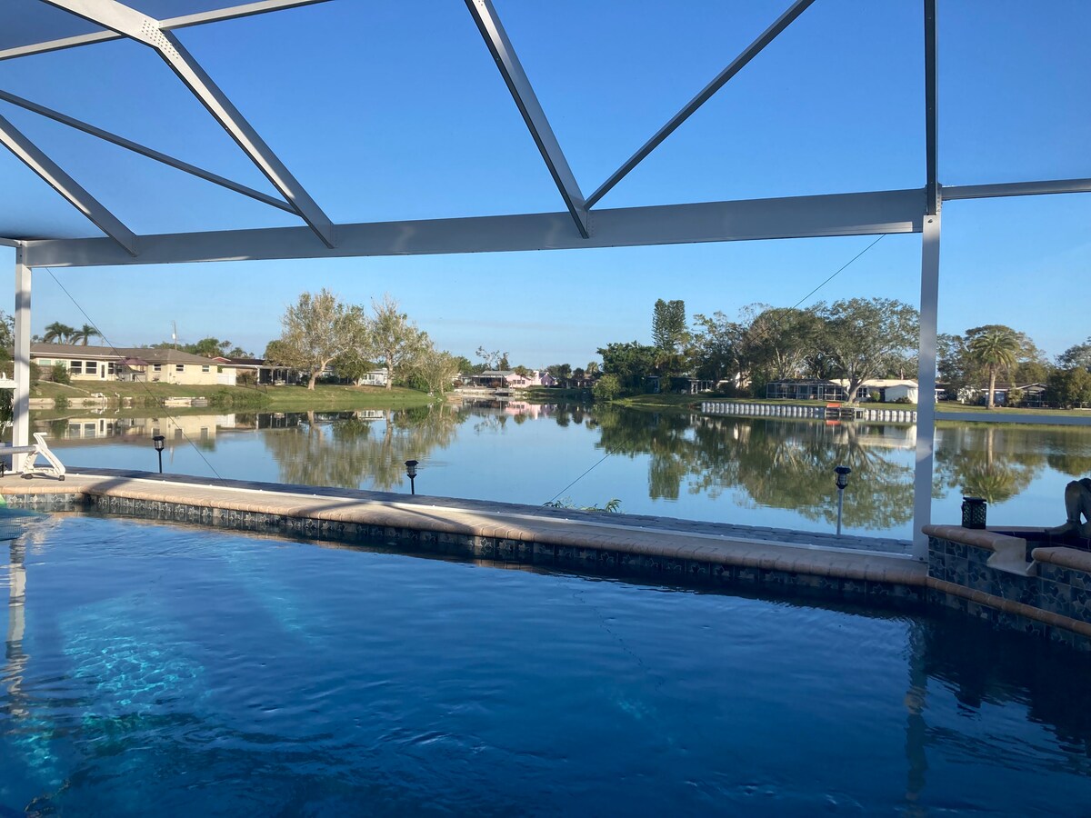 Superhost property: 5 Star! Welcome to Paradise!Serene, private and loaded with all you need to unwind. This spectacular lake front home is minutes to the beach and Venice. Enjoy our new screened lanai with panoramic view. Our home is set back w/gardens, heated pool , lakeside patio & now, two king beds. A slice of the Tropics is found here, hospitality at its best! Home best suited for mature adults and their children ages 16 and up. Come home where paradise awaits.