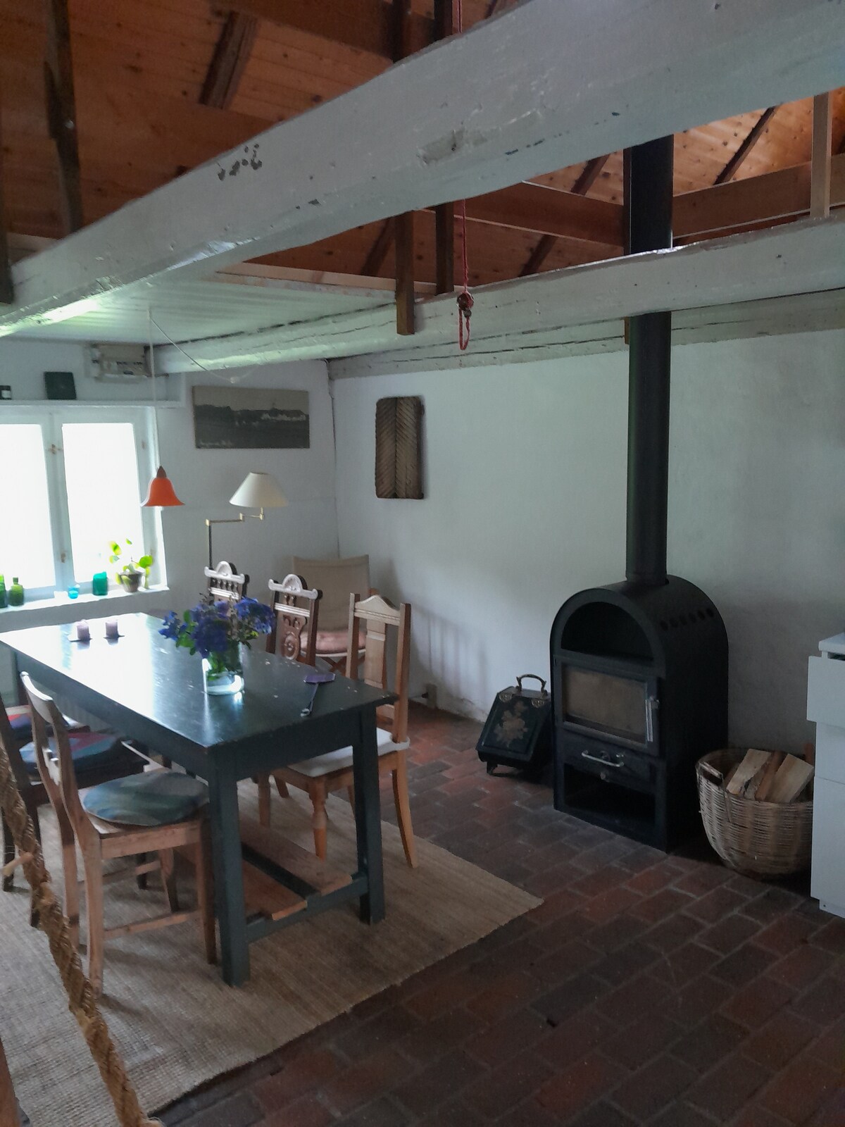 Lille hyggeligt ,rustikt hus i direkte forbindelse med drivhus. Huset er anneks til vores stråtækte bolig der er beliggende i sydvendt skovbryn Omgivet af stor have. I huset dobbeltseng, sofa og sofabord og stige til lille hems. Huset opvarmes med brændeovn ,brænde inkl .Enkle køkkenfaciliteter, men muligt at tilberede et varmt måltid. Toilet og bad i hovedhuset, direkte ved indgang fra gæstehuset. Toilet og bad adskilt ,deles med værtsparret. Huset ligger smukt, nær fjord ,hav ,Nationalpark Thy