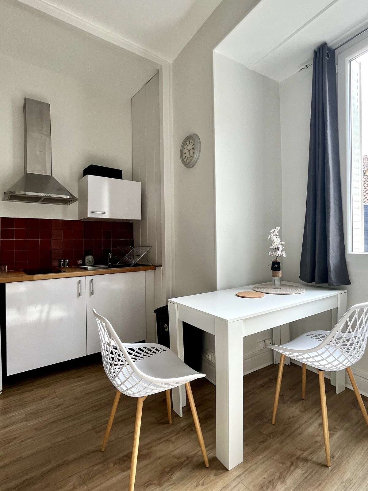Maisonnette avec terrasse en centre ville, à 5 min de la gare, tous commerces, restaurants. Appartement meublé, salon avec lit 140x190, sommier et matelas neufs, cuisine équipée, plaques électriques, mini four, micro-onde, frigo, cafetière, bouilloire, grille pain, vaisselle et ustensiles de cuisine, thé, infusion, huile, vinaigre, sel, poivre. Bureau et dressing, TV. wifi, Interphone, et surtout, une terrasse et un petit jardinet avec table, 2 chaises et une chaise longue pour se délasser.