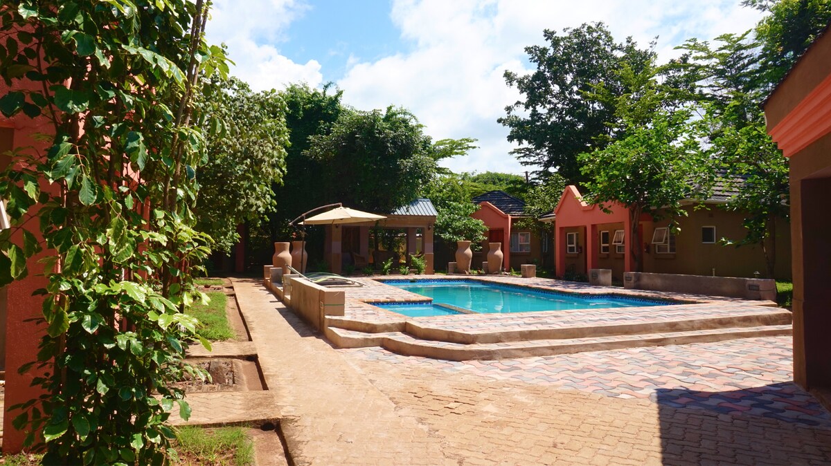 - Charming, clean, and budget-friendly place. - The Suite measures 20.3m² & is perfect for guests seeking a rustic, clean, and homely environment to relax. - Centrally located with easy access to Victoria Falls and other local attractions. - Offers a campsite for guests who are nature lovers. - Outdoor restaurant overlooking the pool. - Backup solar ensures lights and Wi-Fi are always available. - Teas/coffee available