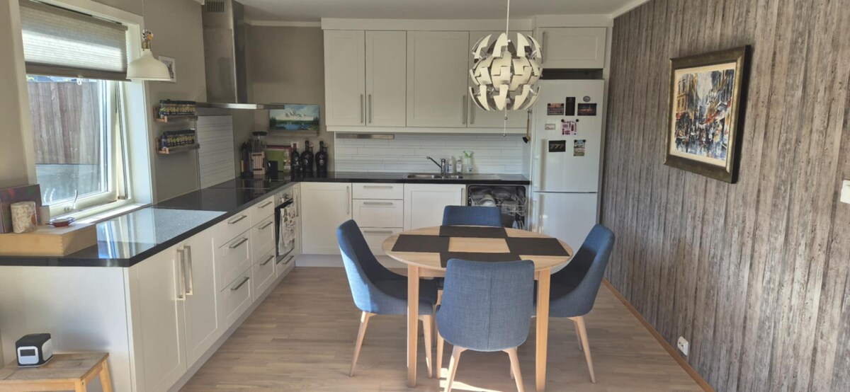 Namešten apartman sa dnevnim boravkom, kuhinjom, kupatilom i dve spavaće sobe na drugom spratu u mirnom području unutar prstena. 4 spavaća mesta. Spavaća soba 1 bračni krevet, spavaća soba 2 kauč na razvlačenje. Pješačka udaljenost do UIA. Oko 3 km od centra Kristiansanda (7 minuta kolima). Zajednički ulaz, vešernica u podrumu sa mašinom za pranje veša i mašinom za sušenje veša. Parking u dvorištu (u brdu, gore u dvorištu, ne ispred garaže). Pogodno za miran par, malu porodicu sa decom. Poželjno je da budete uredni. 15-20 minuta hoda do autobusa na UIA. Blizu kupališta i igrališta.