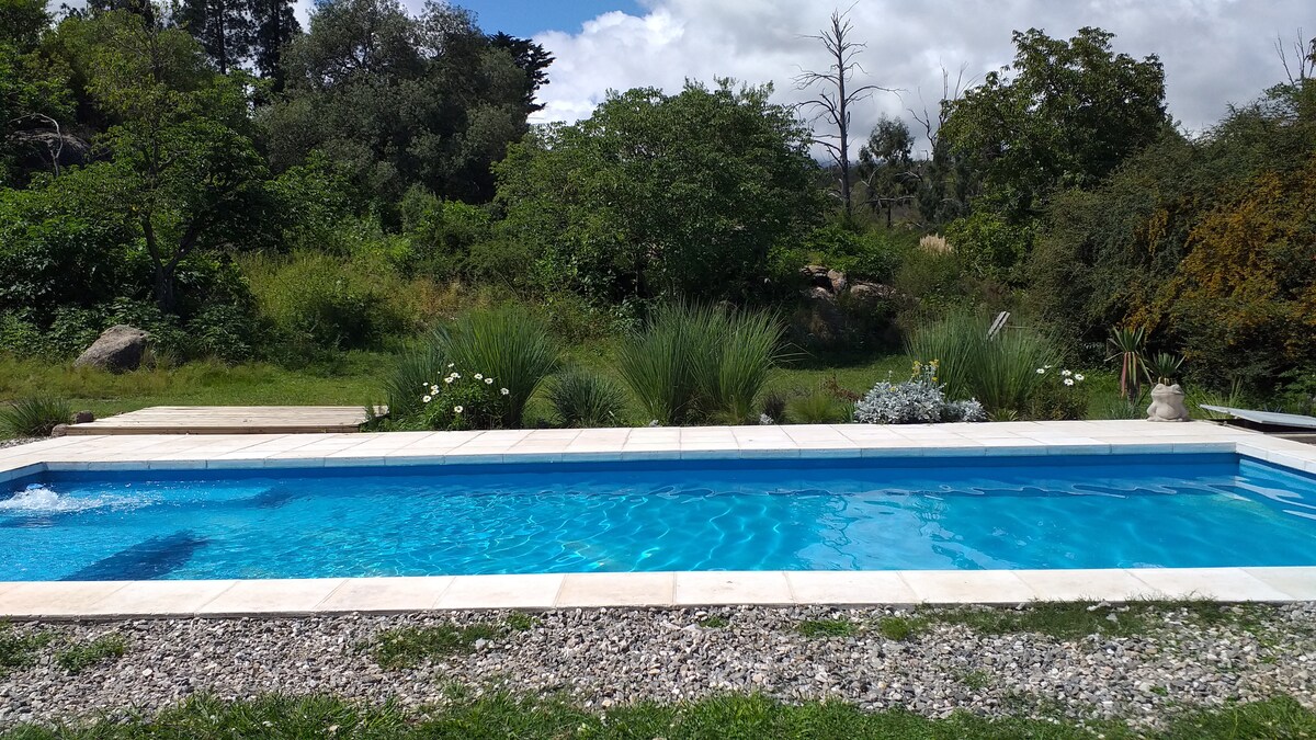 Cabaña al pie de las sierras con bajada propia al arroyo. Inmerso en el monte nativo rodeado de naturaleza. En el verano su mini piscina con vista a los cerros, su galería con asador y su gran jardín serán tu refugio. La salamandra te dará calor en invierno mientras disfrutas de la vista a los cerros nevados . La casita está pensada para que la privacidad sea lo más importante.