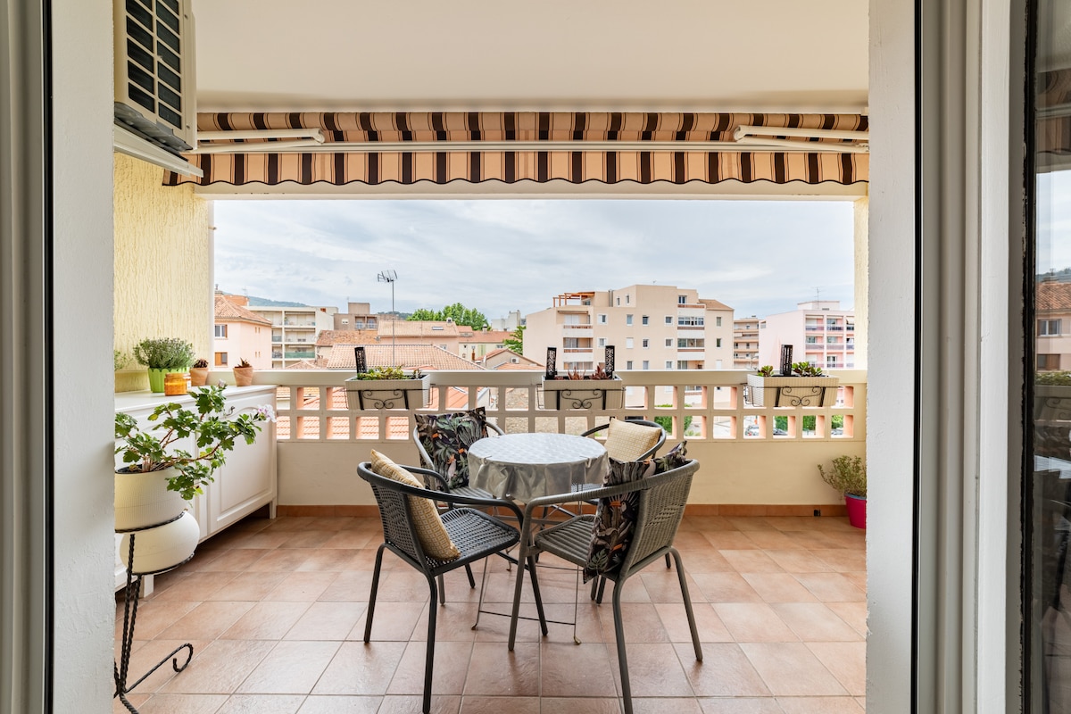 Spacieux T2 terrasse, entièrement rénové, doté d'une magnifique vue sur Porquerolles et Port Cros . Il surplombe la vieille ville (quartier très calme). Il est climatisé, équipé wifi et de Netflix. Il dispose d'une belle terrasse ombragée, avec vue imprenable sur la Collégiale Saint Paul. Les commerces, marchés, restaurants, cinémas sont situés à 2' à pied du logement. Un parking extérieur vous est réservé à 200m de l'appartement. Les draps et les serviettes de toilettes sont fournis.