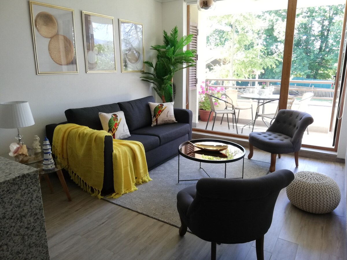 Luminoso y acogedor departamento full equipado, entorno muy tranquilo, a pocas cuadras del centro de Pucón. Rápido acceso al lago, centro y vías que conectan con todos los atractivos turísticos de la zona. Puedes ir caminando (10 minutos) al centro sin la necesidad del auto. Dormitorio en suite, ventanas termopanel, estacionamiento privado. Muy bien equipado para una cómoda estadía, cocina full, Wifi fibra óptica, gimnasio, piscina (periodo estival).