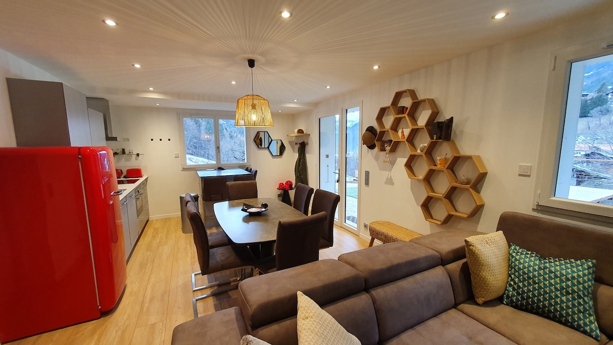 Stan od više od 70 m2 renoviran na podu bašte. Izložba Ouest sa pogledom na planine. Nalazi se u srcu doline (7 km od Thônes, Grand-Bornand i La Clusaz, 25 km od Ansija). Privatni pristup smeštaju, besplatan parking ispred stana. Mirno i opuštajuće mjesto. Potpuno opremljen stan, posteljina, obezbeđen, kišobran, stolica za hranjenje. Aparat za fondue i brisače Može da primi 4 osobe (maks. 6: sofa). Lokalno biciklom i skijanjem. Doručak (čaj , kafa, džem)