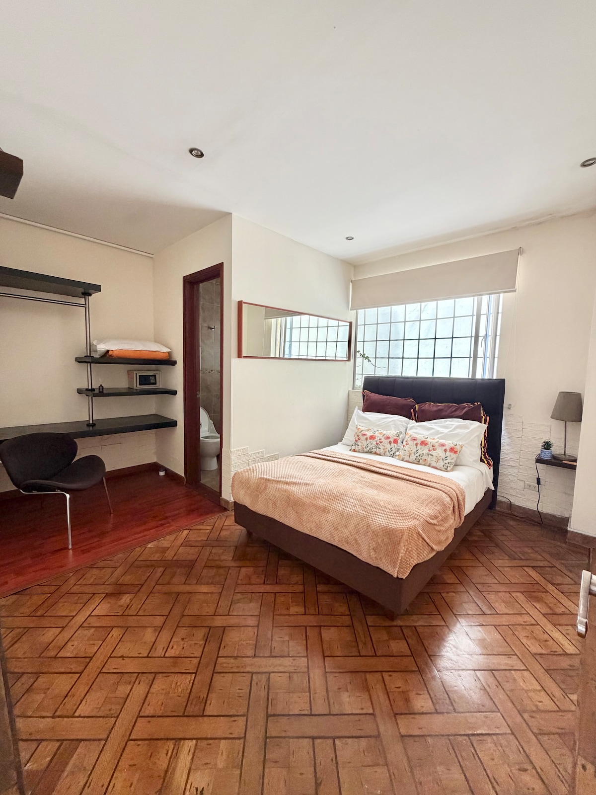 Naš udobni jednosobni apartman-studio, unutrašnja lokacija sa prozorima prema garaži i prema dvorištu, boemskom, minimalističkom, sa malom baštom ima pravi gradski osjećaj! U njemu se udobno mogu smjestiti četiri osobe, a nalazi se u centru ulice, sa jednostavnim pristupom gradskom parku Sajmon Bolivar. Uživajte u kompletnoj kuhinji i pristupu Transmileniju. Ovaj prostor je idealan za dve osobe; međutim, obezbeđujemo kvalitetan kauč na razvlačenje za još dve osobe u slučaju potrebe. Topla voda