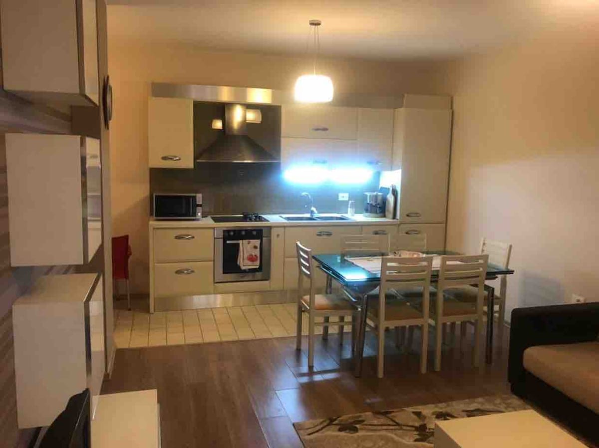 Osjećajte se kao kod kuće u ovom udobnom, elegantnom stanu samo 10 minuta hoda od Starog bazara i centra grada. Samo 2 minuta od glavne autobuske stanice! Sadrži udoban krevet, izuzetno veliki bračni krevet,elegantnu dnevnu sobu sa besplatnom masažnom stolicom koju možete da koristite koliko god želite,kompletnu kuhinju, moderno kupatilo, klima-uređaj, Wi-Fi,TV u dnevnoj i spavaćoj sobi (2 TV) i mašinu za pranje veša. Čist, miran i savršen za parove, putnike koji putuju sami ili poslovne boravke. Vaš topli i gostoljubivi Gjirokastër!