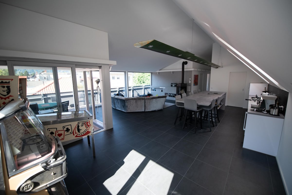 Moderno potkrovlje od 70m2 u Bregencu - na pješačkoj udaljenosti od festivala, jezera i centra grada i javnog prevoza. Idealno za goste festivala! Spavaća soba s velikim bračnim krevetom i izlazom na terasu. Dnevni boravak/trpezarija sa potpuno opremljenom kuhinjom: Nespresso kafa uklj. rashlađenu vodu i sodu vodu iz slavine. nkl. frižider je pun regionalnih pića uz doplatu. Kupatilo sa tušem, mašinom za veš, fenom za kosu i sredstvima za higijenu. Terasa sa salonom i roštiljem. TG + parking i 2 bicikla