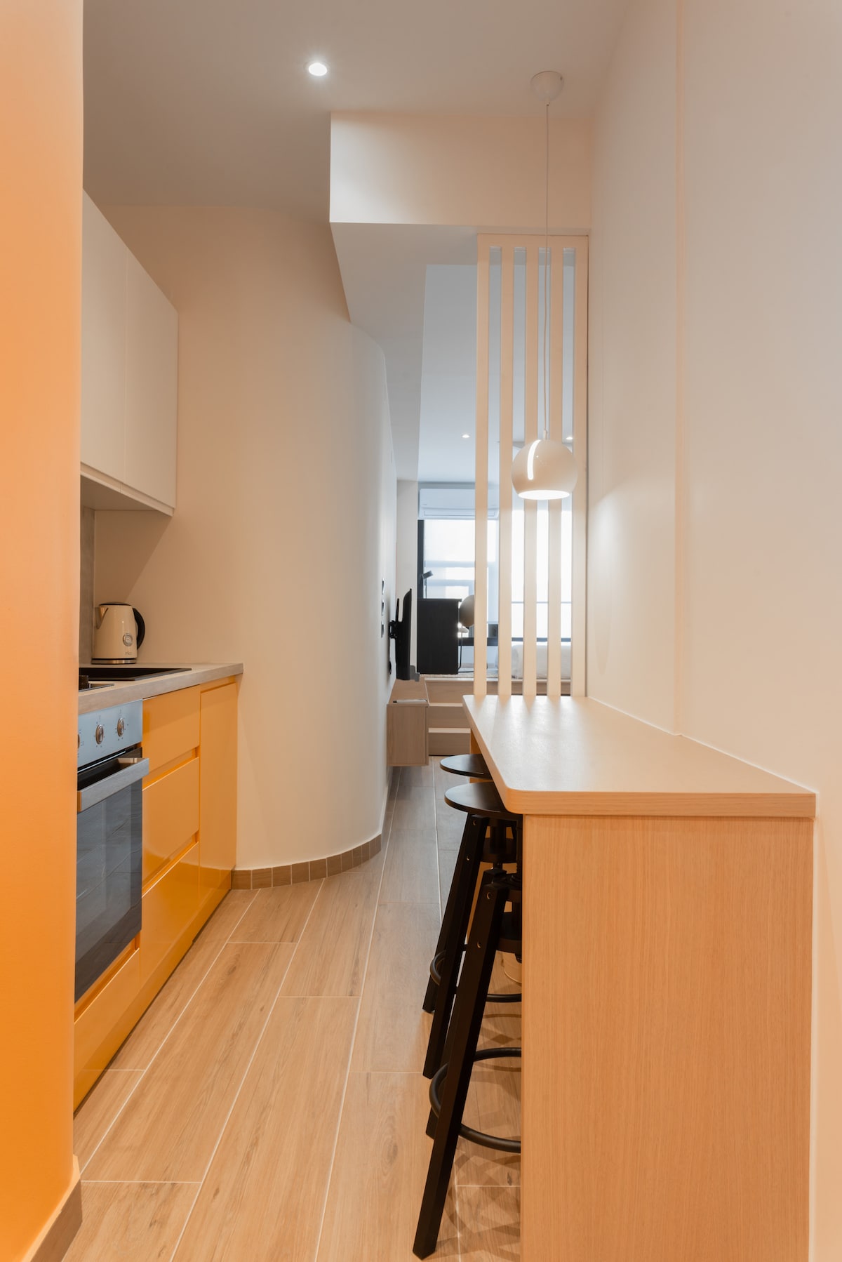 Samostalni apartman površine oko 55 m2 u luksuznoj kamenoj rezidenciji u podnožju stena Meteora. Uređen u tradicionalnom stilu i potpuno opremljen. Ima dve dvokrevetne spavaće sobe, kupatilo i dnevni boravak sa kuhinjom. Ima terasu sa pogledom na stene Meteora i besplatan parking. Lako je dostupan, udaljen samo 2 km od manastira Meteora, 2 km od Kalampake i 300 m od trga Kastraki.