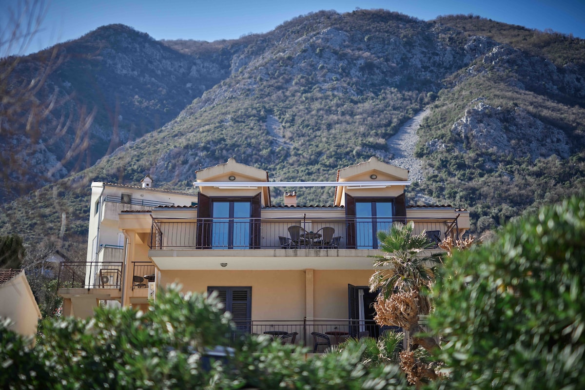 Ovaj jedinstveni smještaj ima sopstveni stil. Sunčani i panoramski penthaus pružaju najspektakularniji pogled na zaliv Boka. Možete uživati u zadivljujućem plavetnilu i zelenilu mora i planina iz svih soba - uključujući kupatilo! Ako želite da se opustite pored zajedničkog bazena ili uživate u aperitivu na svojoj privatnoj velikoj terasi ili samo pročitate odličnu knjigu pored prozora, a priroda vas i dalje očarava - ovo je pravo mjesto za vas!