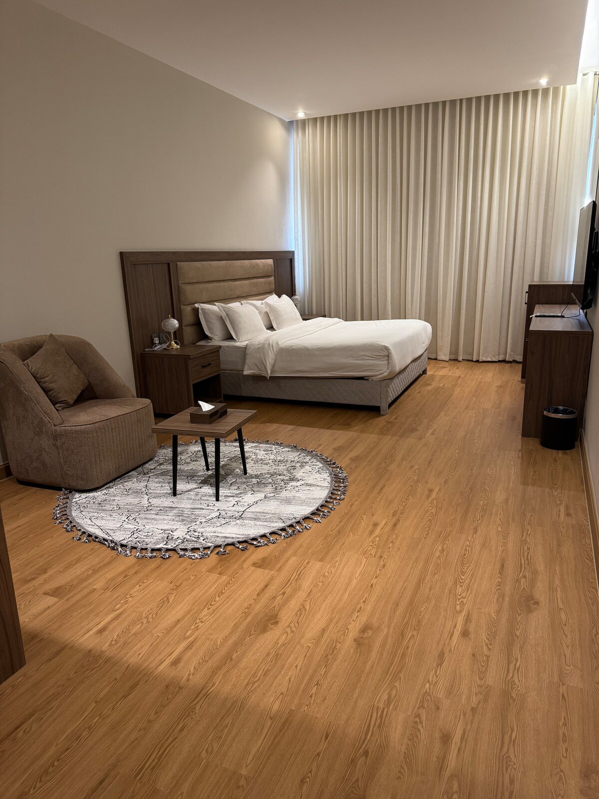 Ovaj miran i elegantan prostor. Dizajniran sa modernim i modernim stilom koji vam pruža sve što vam je potrebno za udoban i luksuz. Stan se sastoji od udobne spavaće sobe i prostranog dnevnog boravka, koji pruža savršen prostor za odmor i opuštanje nakon dugog dana. Gdje možete da čitate knjige i uživate u gledanju filmova na Netflix-u, šifrovanim i besplatnim kanalima, uključujući sve sportske kanale. Lokacija smještaja takođe ima jednostavan pristup različitim uslugama i sadržajima.