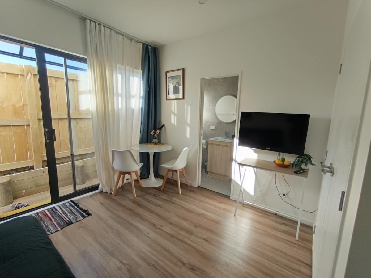 Quiet modern Studio Flat, close to shops, beaches and public transport. Entire home/apt · 1 queen bed · 2 guests. Fresh, crisp and clean, with a new heatpump/aircon for your comfort. A wonderful open plan kitchen, living area and bedroom with a queen bed that looks onto the garden from a private deck. Secure parking in carport. We warmly welcome travellers from around the world, and speak german, english, and limited french.