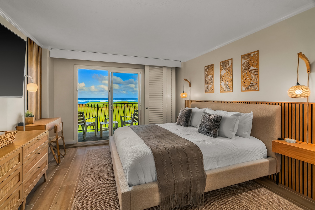 Jedna od najboljih soba u odmaralištu Kauai Beach Resort! Jedna od samo 10 soba uz okean, nedavno renovirana i moderna. Cijena ove sobe je jeftina u ovom luksuznom odmaralištu. Nudi klima-uređaj, novi raskošni bračni krevet i spektakularan pogled. Nalazi se duž kilometara privatne plaže i ima 4 bazena, hidromasažne kade, spa centar, fitnes centar itd. Manje od 10 minuta od aerodroma, to je idealno mesto za pristup idiličnim plažama, ronjenje sa maskom i disalicom, šetnjama, prodavnicama i restoranima! Omogućava vam jednostavan pristup svemu što Kauai nudi!