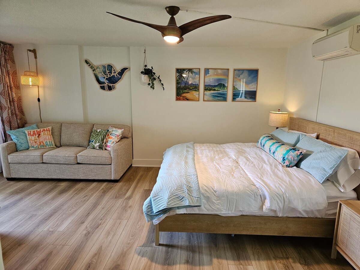 Welcome to our oceanfront Kauai Shores Hotel on the Royal Coconut Coast! Total price includes resort fee $35.39/night collected by hotel upon check-in. Experience our 313 sq ft beautifully renovated room featuring one king bed or two queen beds, separate sitting area, and private balcony/lanai. Enjoy amenities like WiFi, LCD TV, air conditioning, blackout drapes, mini refrigerator, Keurig coffee maker, and daily housekeeping for a perfect stay.