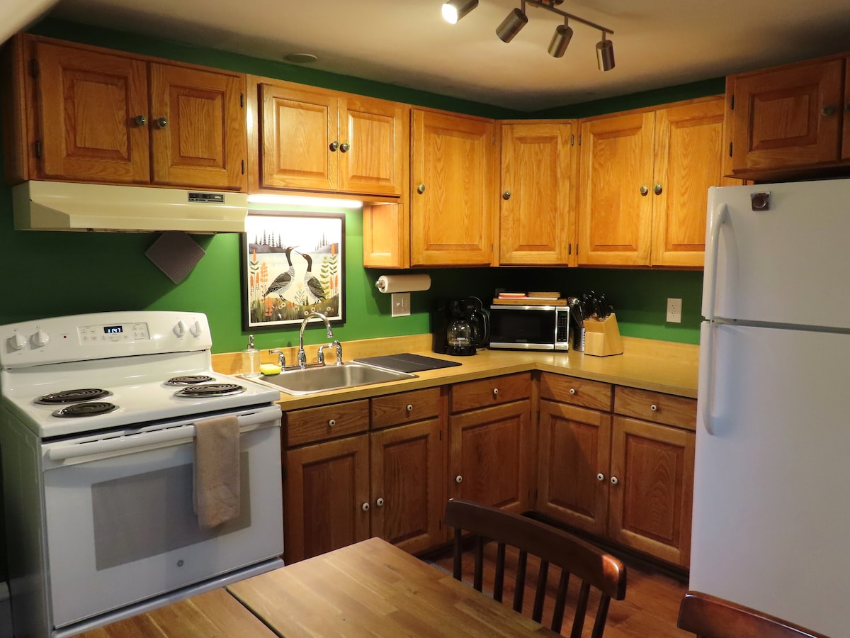 Ovaj divan stan je iznad naše garaže. Možete dolaziti i odlaziti kad god poželite. Stvorili smo mesto za mir i samoću. Sedite na terasu ili pogledajte kroz prozor trpezarije i pogledajte šumu i sačekajte ptice i divlje životinje koje se mogu čuditi kroz dvorište. Na raspolaganju su kafa i čaj, kao i osnovne potrepštine za doručak, ako želite. Ulaz bez ključa vam omogućava da dođete u bilo kom trenutku nakon prijave. Imajte na umu da morate da se osećate prijatno sa stepenicama da biste došli do stana.