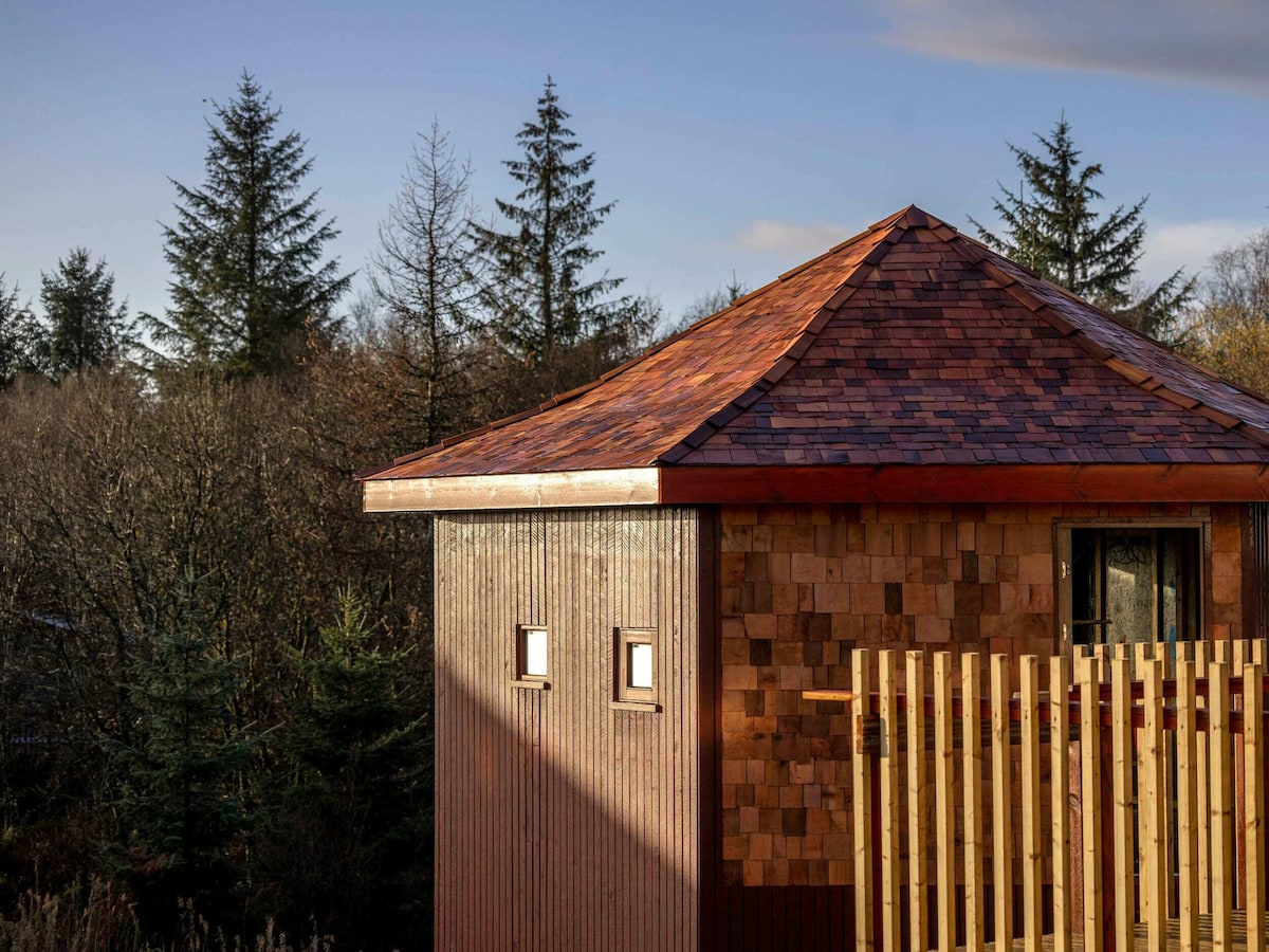 Garwnant Golden Oak Hideaway for two in Brecon Beacons National Park. 1-bedroom with log burner, freestanding bath, hot tub. 400 acres forest, local adventures, starry skies.