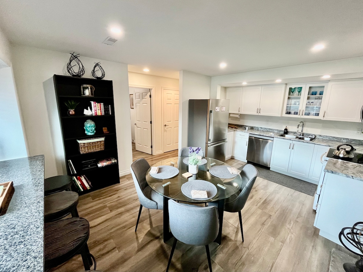 Ovaj dvosobni apartman ima sopstveni prizemni ulaz za potpunu privatnost i jednostavan pristup. Ima dvije bračne sobe, dnevni boravak sa kaučem za 1–2 osobe i potpuno opremljenu kuhinju (šporet, rerna, mikrotalasna pećnica, Keurig, šporet za pirinač, toster, čajnik, posuđe za 6 osoba). Uživajte u namjenskom radnom prostoru s prirodnim svjetlom. Nalazi se u mirnom Valnut Grouvu u blizini parkova, prodavnica, Hvi 1, Fort Lengli i drugih.