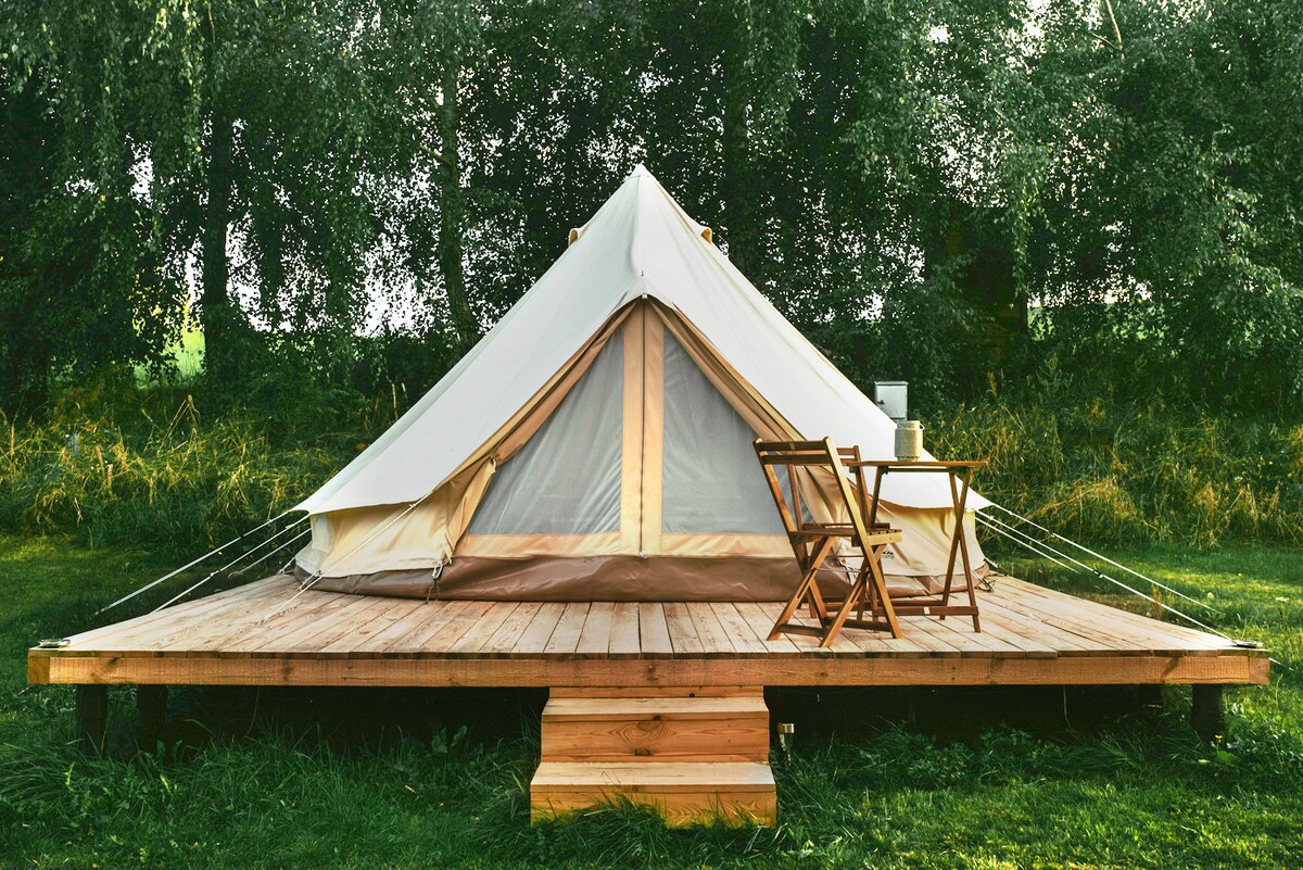 Namiot w stylu buddyjskim, wyposażony w stół z dwoma krzesłami łóżko podwójne i lampę. Namiot przystosowany dla maks. 2 osób z dostępem do prądu, prywatną łazienką zlokalizowaną w pobliskim budynku oraz wspólną w pełni wyposażoną kuchnią. Do dyspozycji gości oddajemy palenisko z funkcją grilla. Zapewniamy zestaw narzędzi do grilla, oraz drewno do rozpalenia ogniska w palenisku. Dodatkowo oferujemy pomost tylko dla gości naszego obiektu, łódki, kajaki i rowery w cenie noclegu.