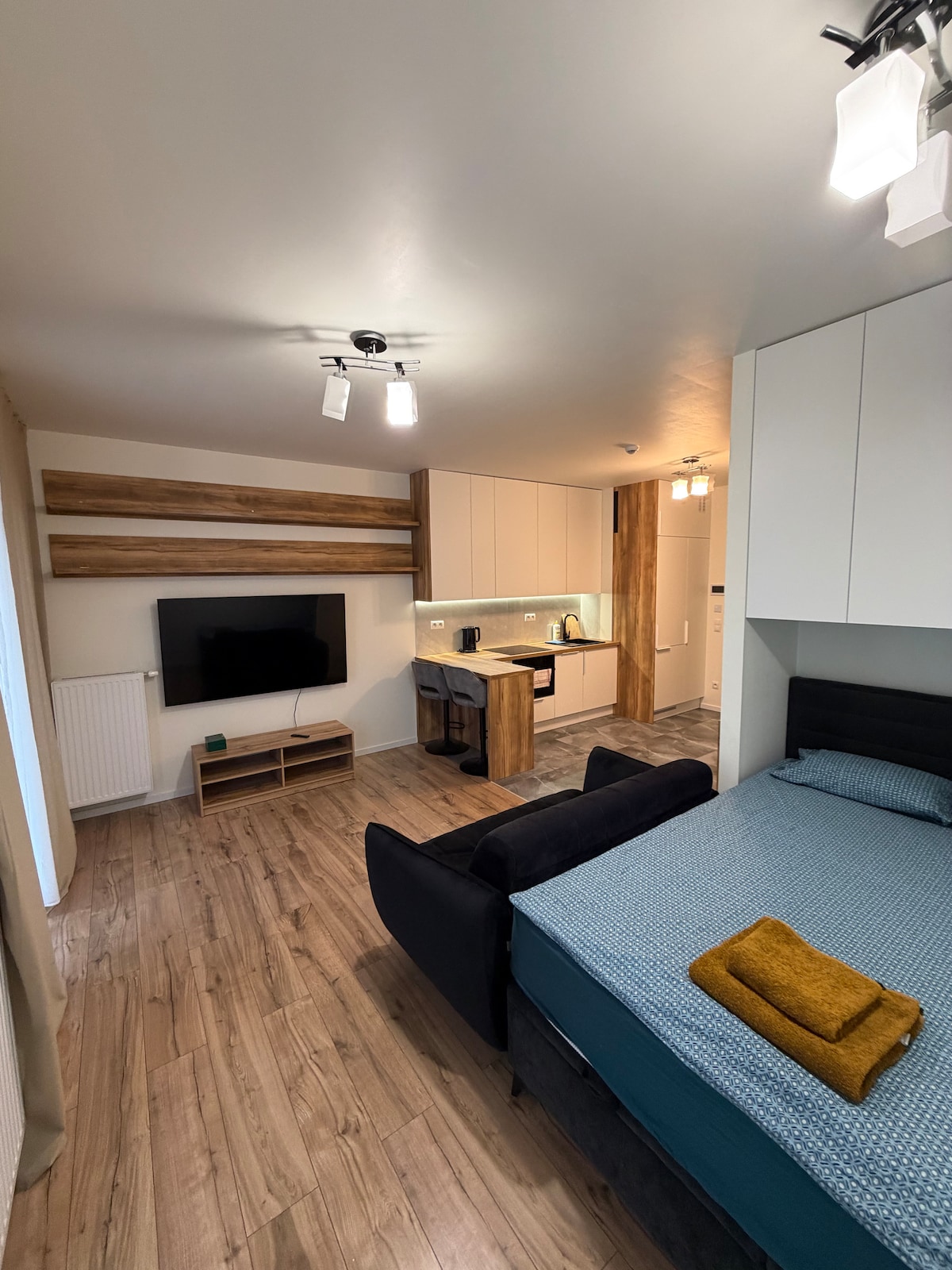 Stan se nalazi u novoizgrađenom, ograđenom, 24-satnom osiguranom bloku sa parkingom. Održava se industrijskim, ali modernim ugođajem. To je dvokrevetni stan, dnevni boravak sa kuhinjom otvorenog tipa. Veliki bračni krevet (spavaća soba) i udoban kauč (dnevni boravak), garderobni ormar i terasa. WI-FI, TV sa međunarodnim kanalima. Lokacija: 7 minuta hoda do metroa, željeznička stanica u trajanju od 5 minuta, voz od 40 minuta do bilo kog aerodroma.