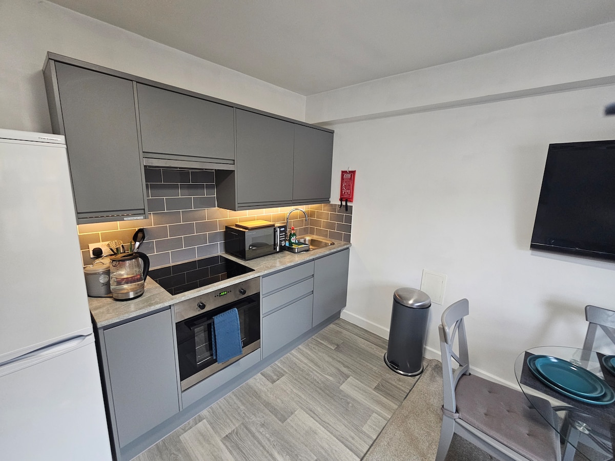 Prekrasan samostojeći studio sa terasom i besplatnim parkingom. Sadrži bračni krevet, stolicu i radni sto; kuhinju sa frižiderom, sudoperom, pločom za kuvanje i mikrotalasnom rernom i svim potrebnim posuđem i priborom itd.; garderobu, fioke; kupatilo sa tuš kabinom dobre veličine; Wi-Fi TV i USB utičnice; sopstvene sisteme centralnog grejanja i tople vode i modernog ukrasa. Peškiri, peškiri za čaj, sapun, tečnost za pranje i posteljina, zajedno sa nekim osnovnim namirnicama kao što su so/biber, kese za čaj, kafa, šećer, skvoš itd.