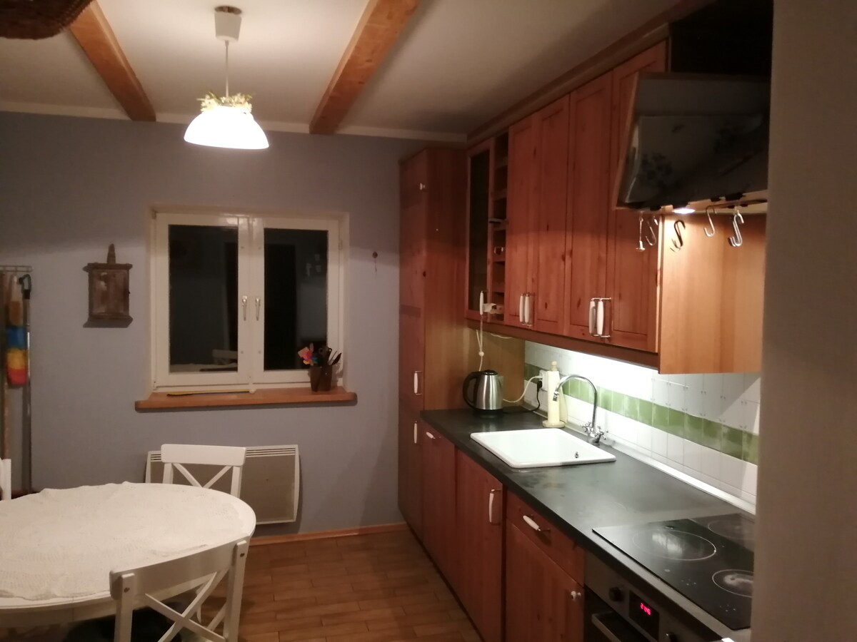 Zapraszamy do małego domku w zabudowie szeregowej z oddzielnym wejściem , miejscem parkingowym, ogrodem, ogródkiem warzywnym, miejscem na ognisko. Dom składa się z kuchni z kominkiem, małej łazienki z prysznicem, dwóch sypialni: jedna z podwójnym łóżkiem, druga z klimatyzacją na poddaszu z trzema pojedynczymi łóżkami.