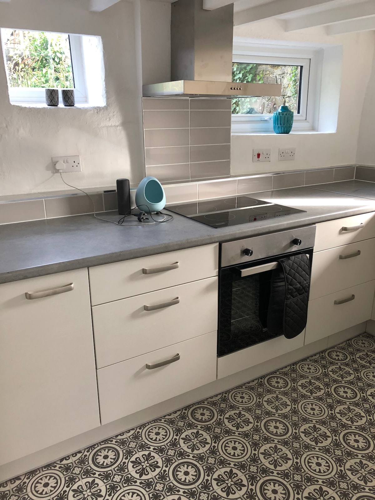 Ova neobična odvojena staja puna je karaktera i mira (nema WI-FI). Postoji kuhinja/dnevni boravak otvorenog tipa sa udobnim gorionikom ( cjepanice su dostupne po cijeni od 7 £ po mreži) i barom za doručak prekrivenim škriljcem. Objekat ima čvrste hrastove podove, osim škriljca u kupatilu, zato ne zaboravite papuče! Kuhinja uključuje rernu, ploču za kuvanje, frižider sa zamrzivačem, toster, mikrotalasnu rernu i čajnik. Udoban prostor za sjedenje otvara se na atraktivno dvorište i travnatu površinu. Žao nam je, nema kućnih ljubimaca