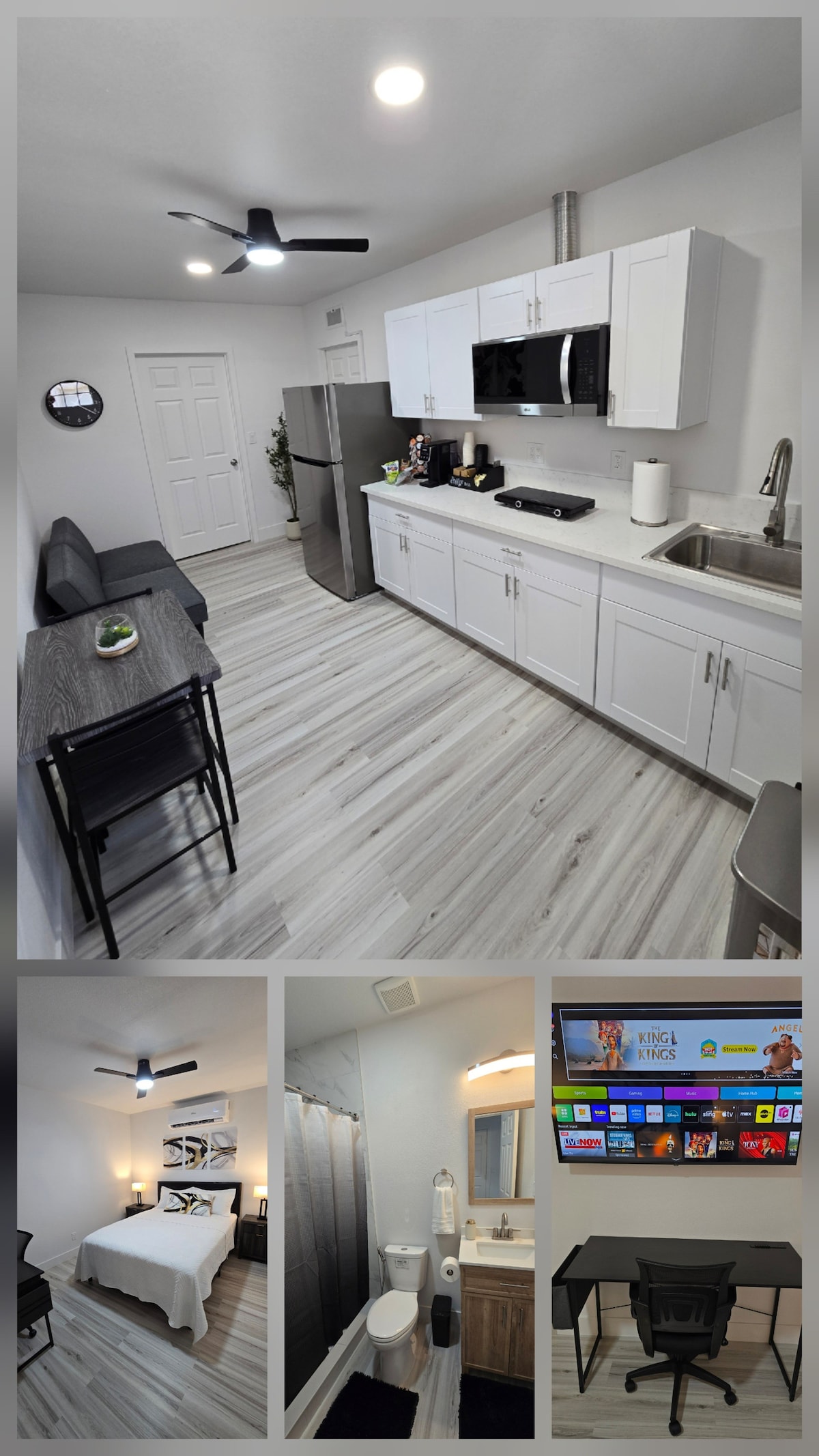 luxurious studio with private entrance, all decorated in black and white colors, has a kitchen with all kitchen accessories, queen bed, folding bed for another additional person, tv , air and heating are individual for the rest of the house since the studio has a mini split installed, it has a smoking area outside